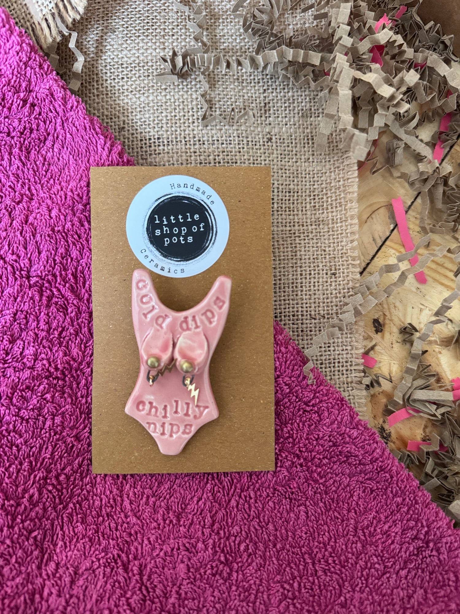 Turquoise stoneware ceramic swimsuit with boobies, gold acrylic nipples and gold lightning bolts. Backed with silver plated badge pin.