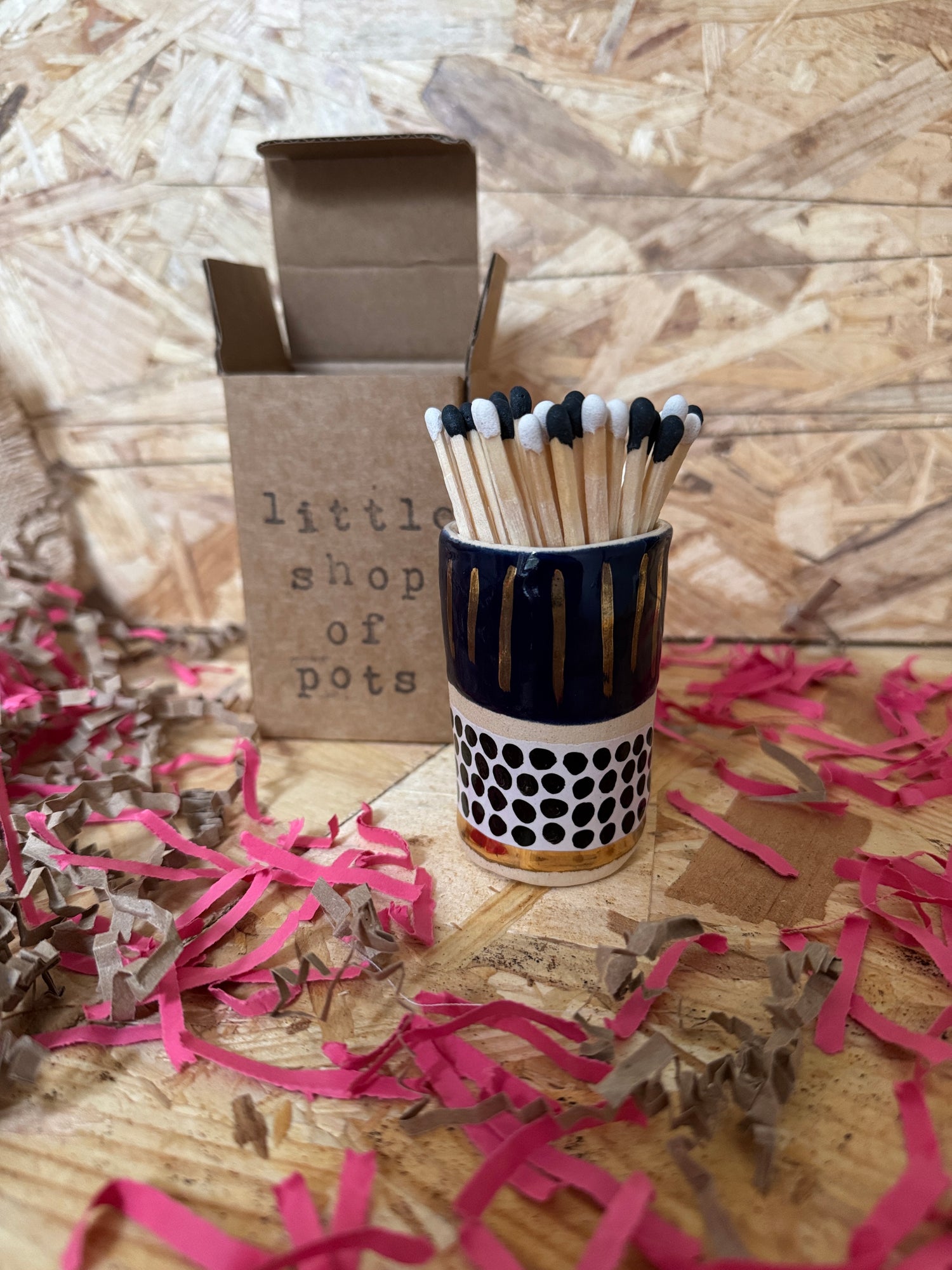 A matchstrike in my classic keystone navy spot design. Handfinished with real gold lustre. Matchstrike paper on the underside of product.