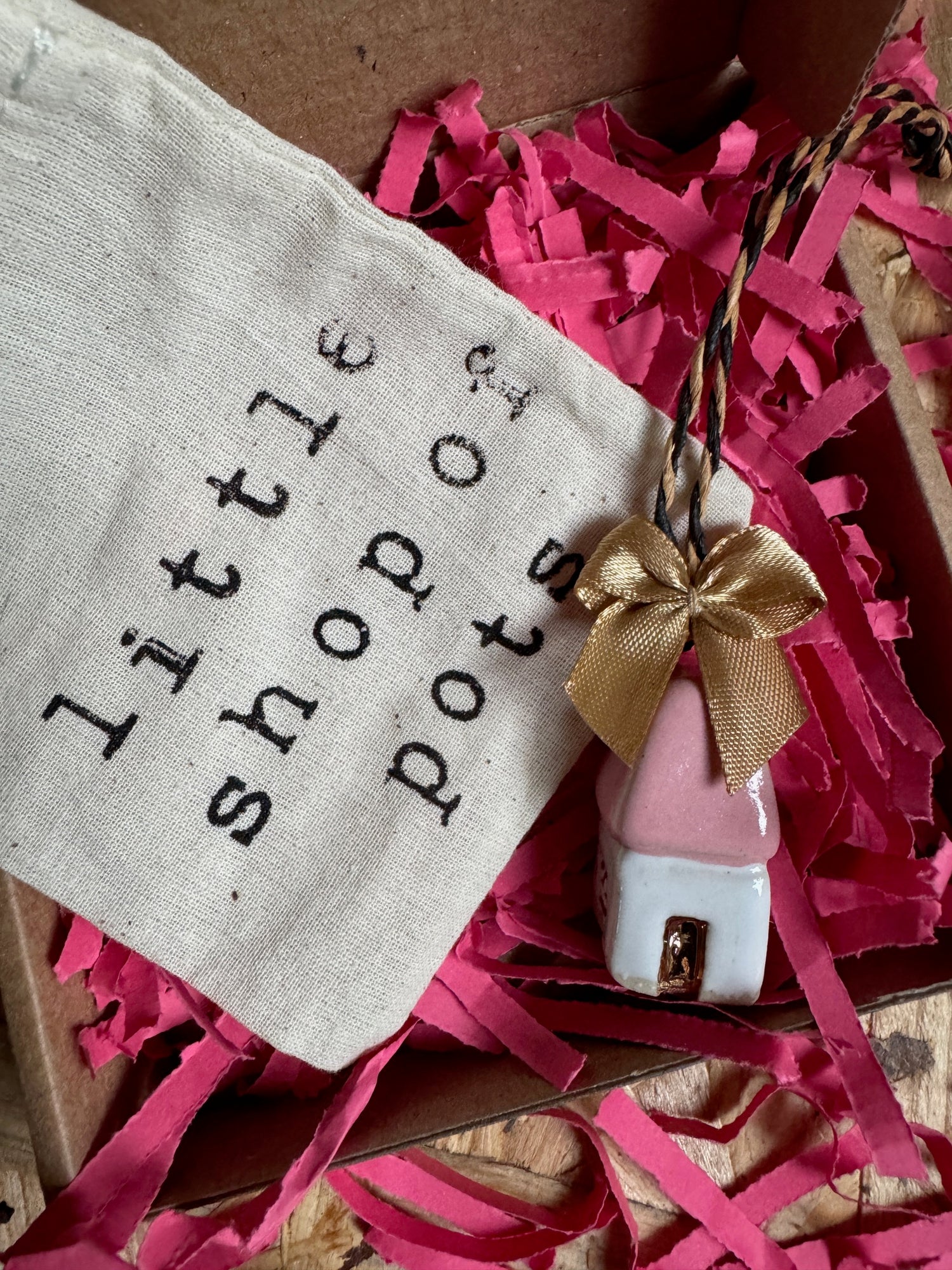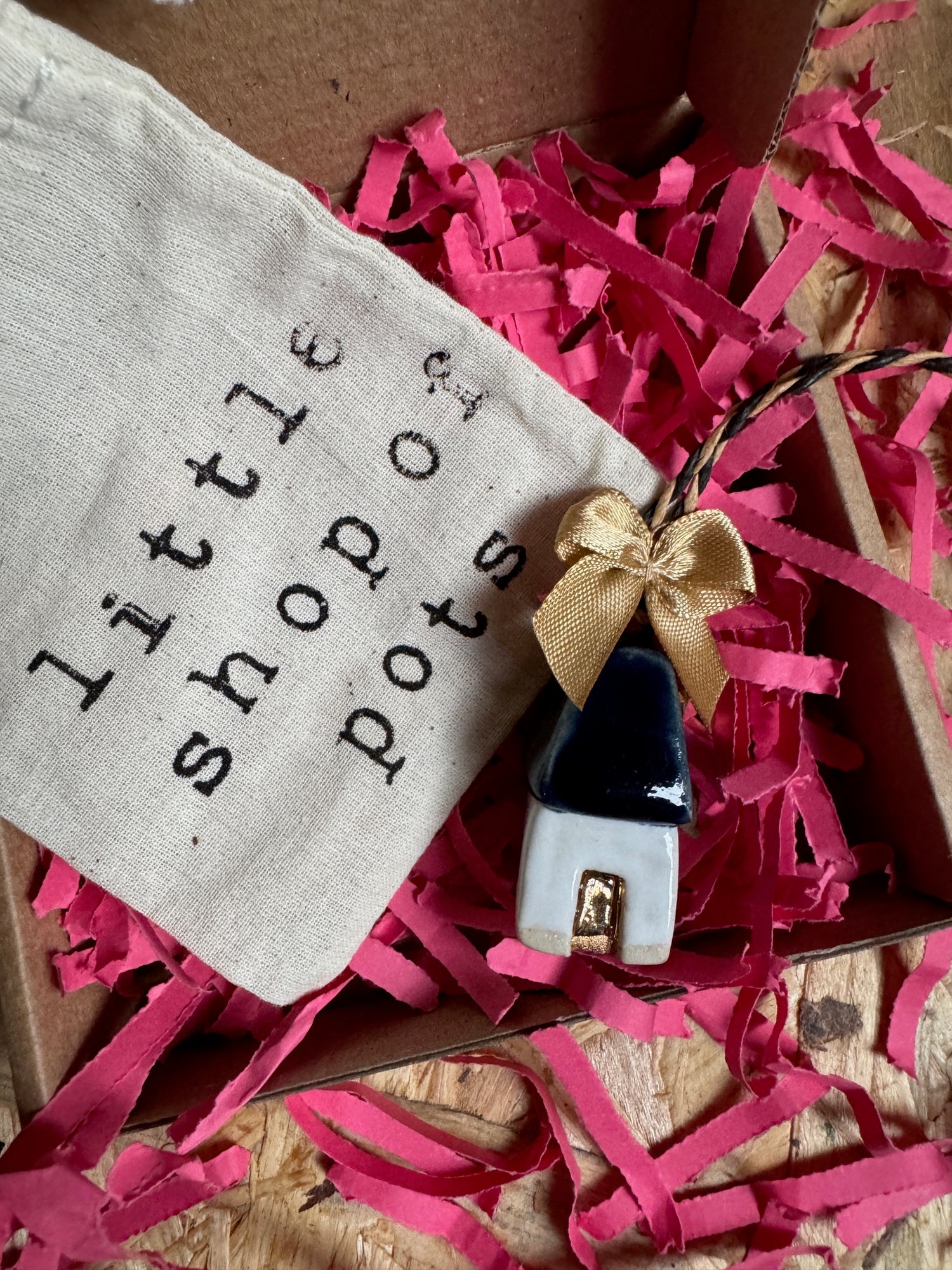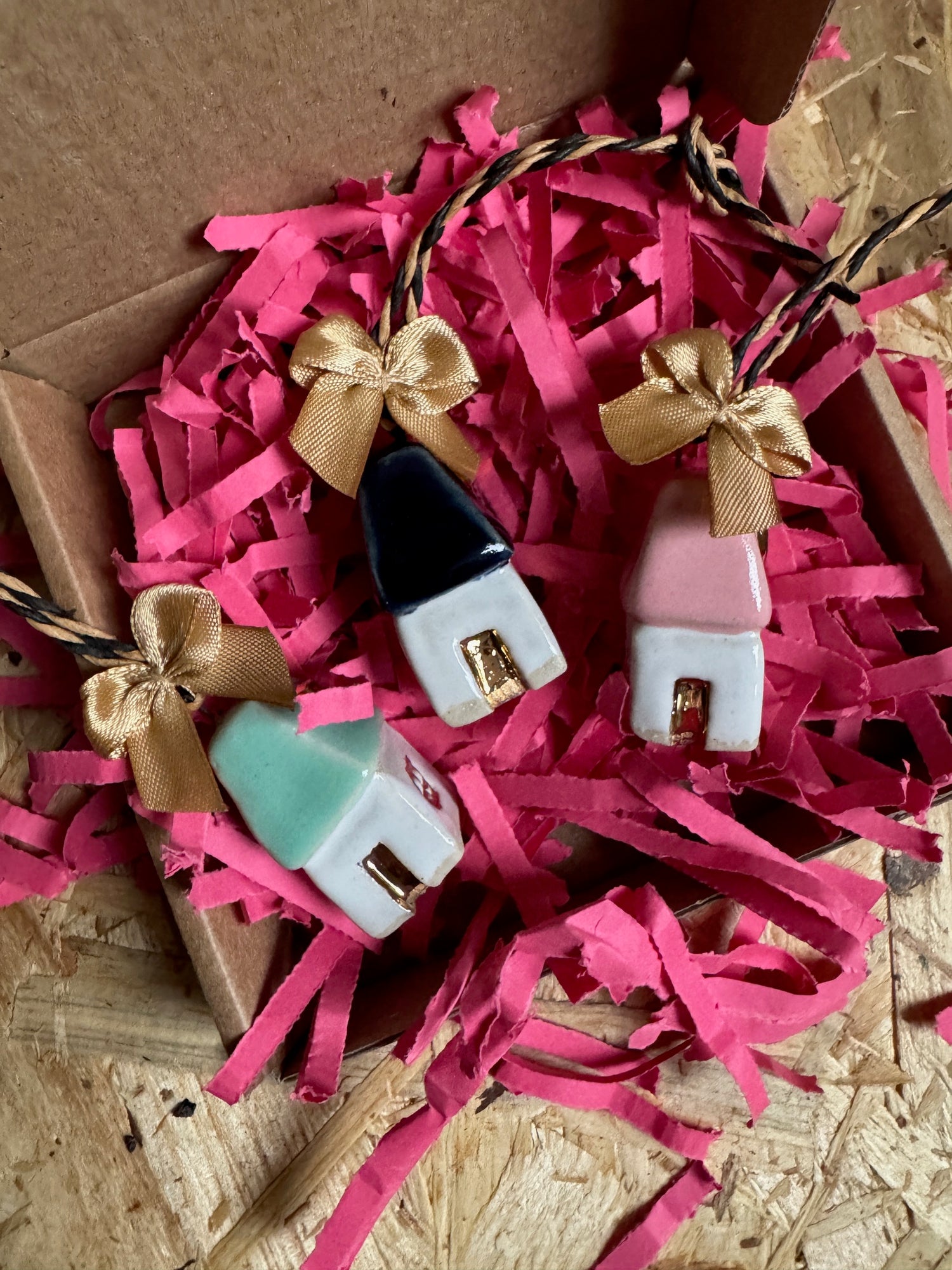 Mini house hanging decorations.* Available in pink, turquoise and navy gloss stoneware, finished with real gold lustre and a hand stitched gold silk bow.