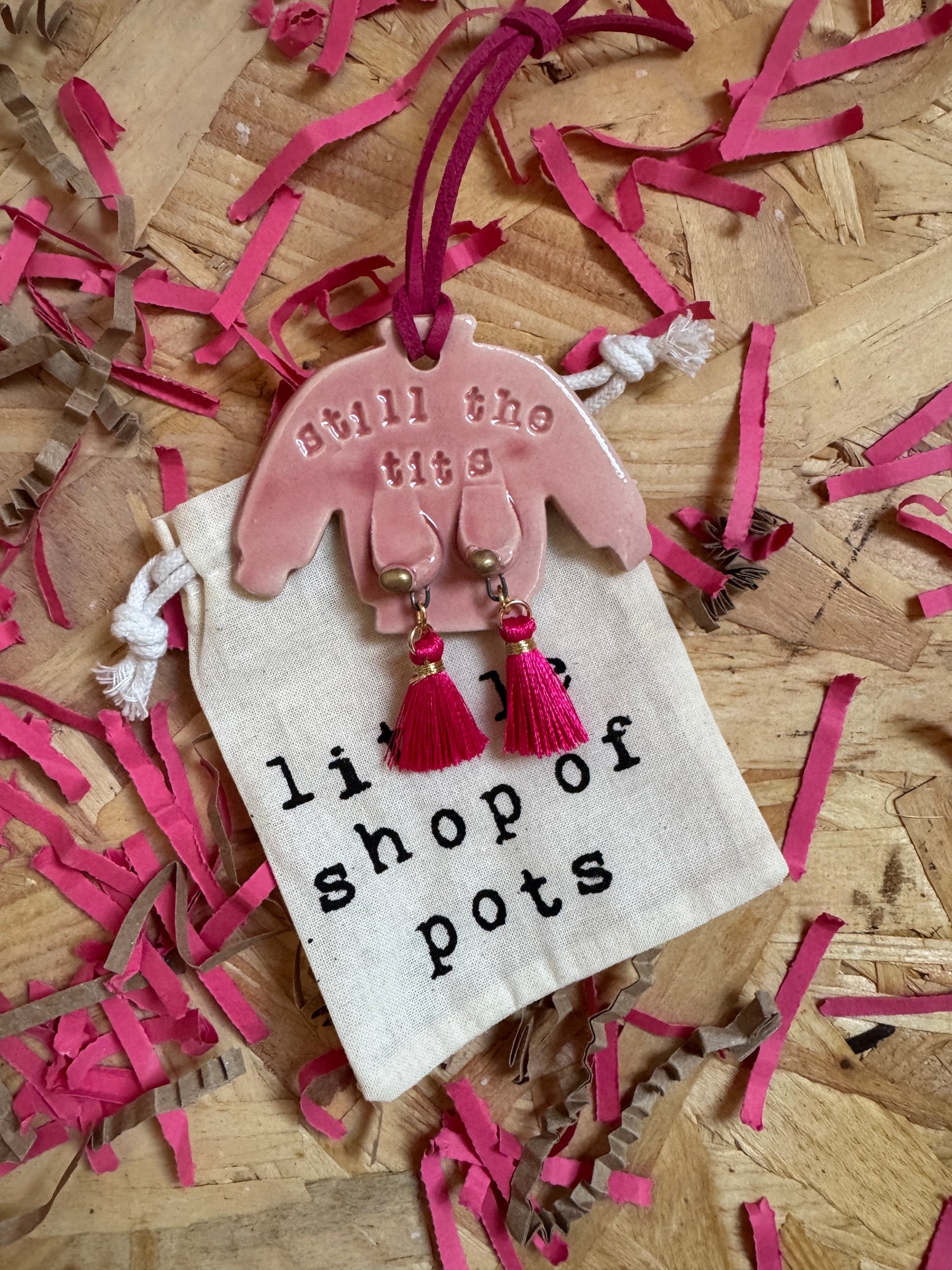 Turquoise stoneware ceramic jumper with boobies, gold acrylic nipples and hot pink nipple tassels!