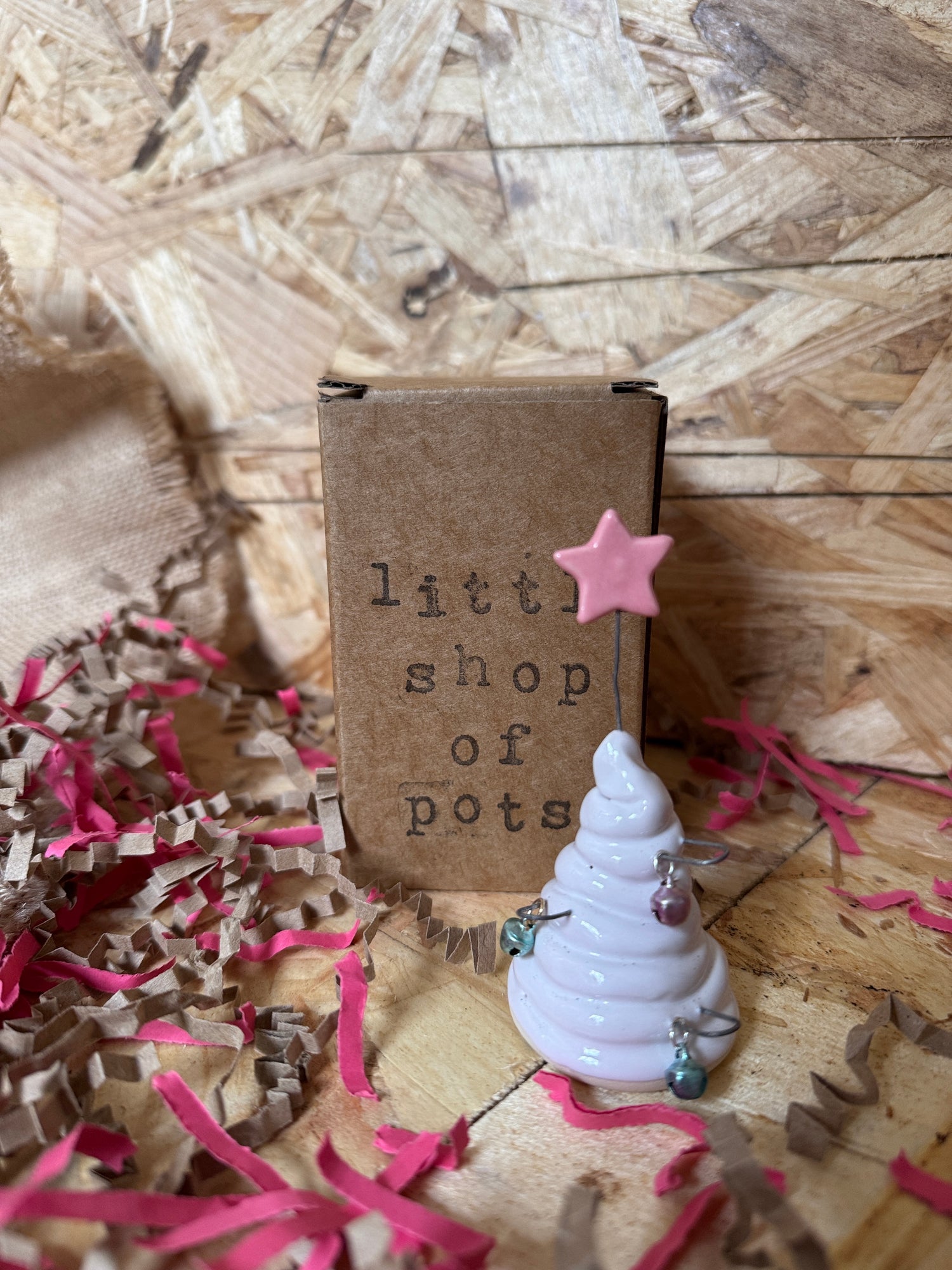 Super cute free-standing stoneware Xmas tree decoration. Complete with it's own Xmas star and jingle bell baubles.
