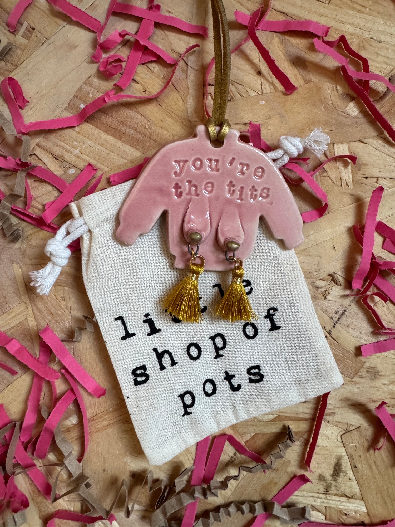 Turquoise stoneware ceramic jumper with boobies, gold acrylic nipples and gold nipple tassels!